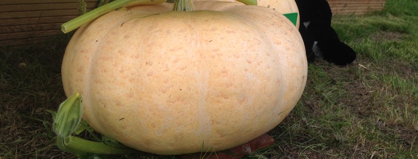 The Summer Holidays are over but the veg garden is still going strong. This is my first attempt at growing pumpkins for Halloween and the weather must have been ideal this year. Planted the seeds back in June and when I cut the leaves back last week this is what I found! All that rain has resulted in some rapid growth. There are only two pumpkins but they are whoppers. They are a bit pale but hopefully now the leaves aren’t covering them they will start to turn a lovely orange. I’m not sure if they will grow any more but I will take my bathroom scales out and weigh them soon. I’ve put them on roof tiles so they won’t rot and put Panda there for scale!